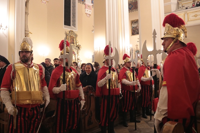 Po odśpiewaniu Męki Pańskiej i Modlitwie Powszechnej nastąpiło odsłonięcie krzyża, adoracja przez duchowieństwo i służbę liturgiczną poprzez przyklęknięcie. Potem odbyła się procesja z krzyżem wewnątrz świątyni. Wierni kilkakrotnie klękali i śpiewali ,,Święty Boże’’. Po komunii św., w asyście Straży Rzymskiej, przeniesiono Najświętszy Sakrament do grobu, gdzie trwa adoracja.