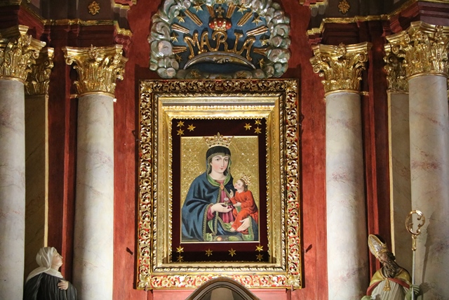Obraz przedstawia Maryję w półpostaci, podtrzymującą na lewym ramieniu Dzieciątko. Wizerunek ten jest zakrywany na co dzień obrazem Zwiastowania NMP. Obraz Matki Bożej Pocieszenia stanowi przedmiot szczególnego kultu. Był on jednak mocno podniszczony i dlatego w 1968 r. poddany został gruntownej konserwacji. Wtedy też usunięto z niego posrebrzaną sukienkę, dzięki czemu malowidło okazało się oczom wiernych w pełnym blasku.