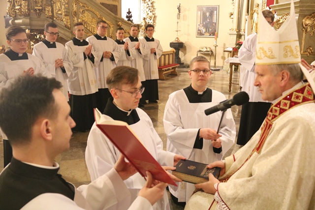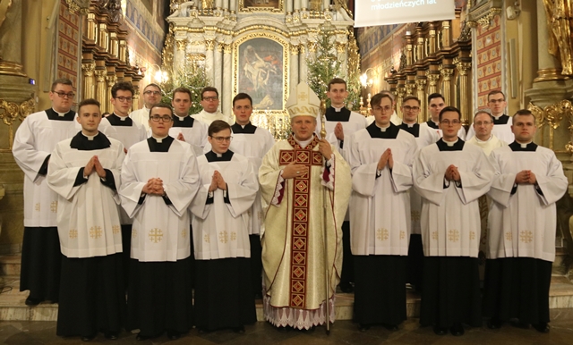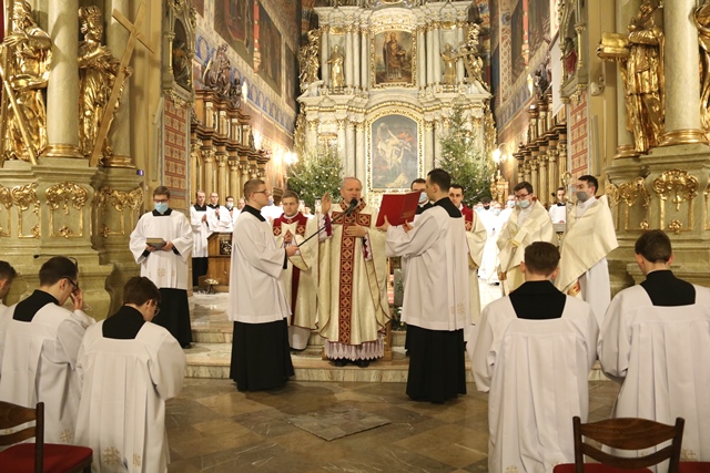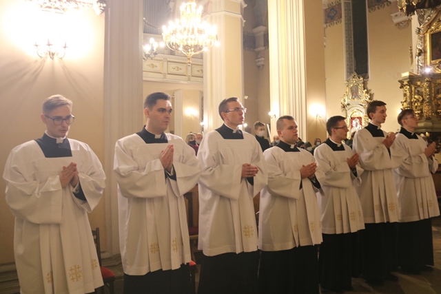 Fot. Ewa Kotowska-Rasiak/KAI– Niech św. Józef szczególnie w tym Roku Świętego Józefa będzie świetlanym, jasnym przewodnikiem, na którego patrzycie, uczycie się odczytywania woli Bożej i odpowiadania na tę wolę – mówił bp Łukasz Buzun do 14 alumnów, którzy przyjęli posługę lektoratu w katedrze św. Mikołaja w Kaliszu.