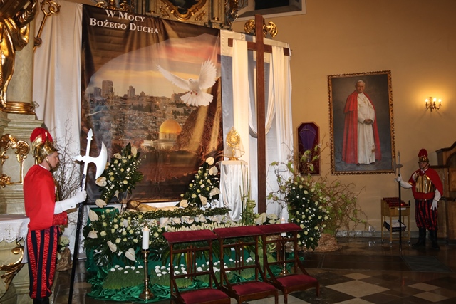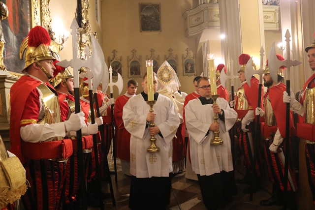 Po odśpiewaniu Męki Pańskiej i Modlitwie Powszechnej nastąpiło odsłonięcie krzyża i procesja z krzyżem wewnątrz świątyni. Wierni kilkakrotnie klękali i śpiewali ,,Święty Boże’’. Po komunii św., w asyście Straży Rzymskiej, przeniesiono Najświętszy Sakrament do grobu, gdzie trwa adoracja.