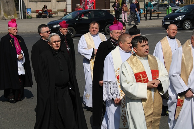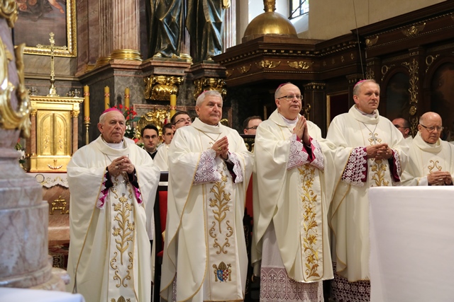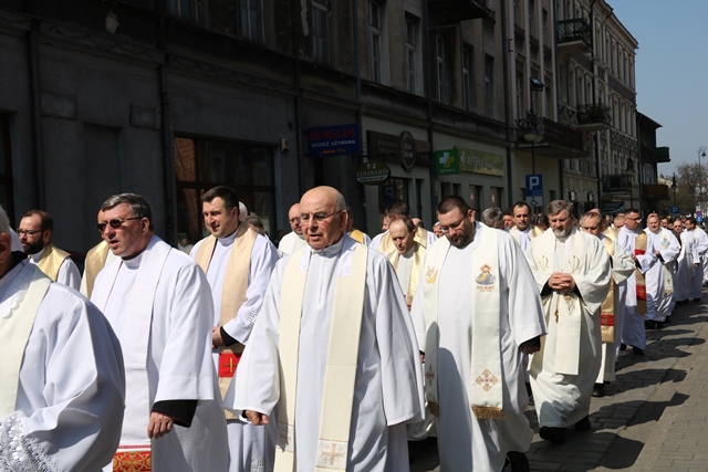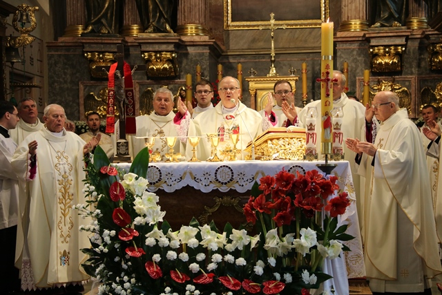Biskupów i kapłanów powitał bp Edward Janiak. – Księże Biskupie, proszę modlić się za nas, abyśmy byli bliżej Boga, byli autentycznymi świadkami Chrystusa Zmartwychwstałego. Ogarniamy naszą pamięcią kapłanów chorych na czele z ks. biskupem Teofilem i starszych, którzy łączą się z nami duchowo. Raduje się moje serce, że bazylika wypełniła się dzisiaj tak pięknie kapłanami Kościoła Kaliskiego – powiedział biskup kaliski.