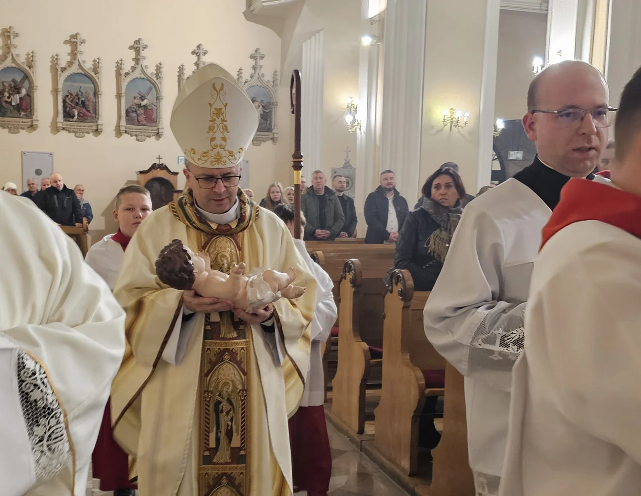 Fot. Ewa Kotowska-Rasiak/KAI– Czas świąt to czas spotkań. Spotykamy się z najbliższymi, z przyjaciółmi, z innymi osobami, ale czy spotykam się z Nowonarodzonym, czy mam czas dla Jezusa? – mówił bp Damian Bryl, który przewodniczył Pasterce w katedrze św. Mikołaja w Kaliszu. Przed rozpoczęciem Eucharystii w procesji biskup kaliski zaniósł figurkę Dzieciątka do żłóbka.