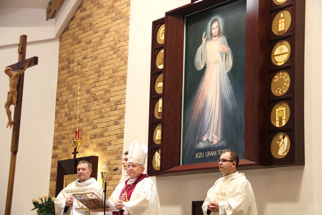 Wraz z biskupem kaliskim Edwardem Janiakiem modlili się: ks. prał. Andrzej Szudra, kustosz Sanktuarium Miłosierdzia Bożego w Ostrowie Wielkopolskim, ks. kan. Jarosław Gzik, proboszcz parafii św. Stanisława Biskupa w Żerkowie i ks. kan. Krzysztof Duchnowski, kapelan biskupa.