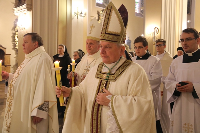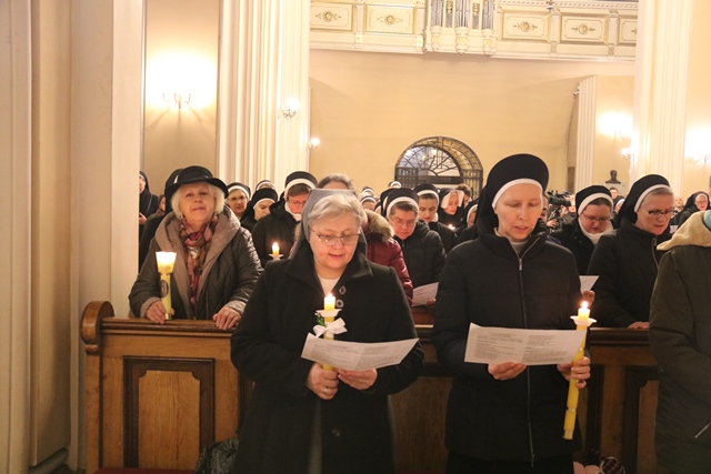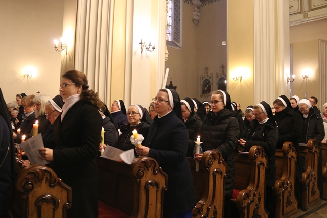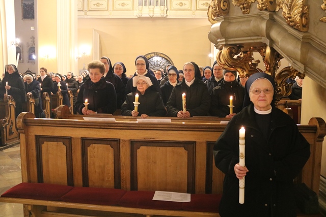 Na początku Mszy św. osoby konsekrowane procesyjnie przeszły z zapalonymi świecami do nawy głównej kaliskiej katedry. Świece poświęcił bp Łukasz Buzun.