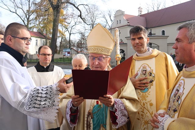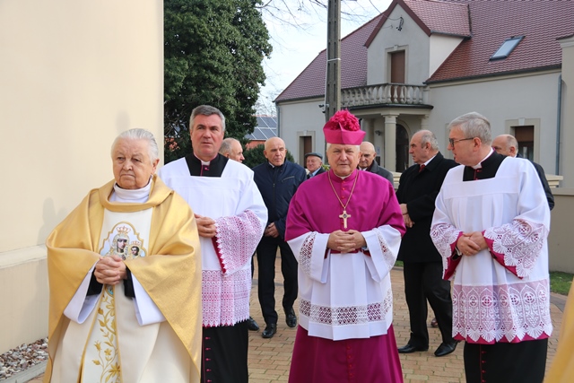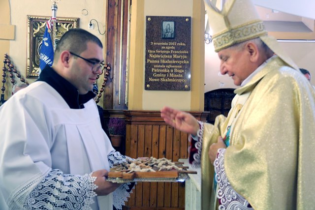 Po Eucharystii biskup poświęcił pomieszczenia nowego Domu Parafialnego, w tym mieszkanie wikariusza ks. Marcina Nowickiego. Modlił się też przed obrazem Matki Bożej Skalmierzyckiej.