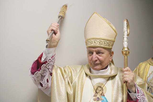 Fot. Ewa Kotowska-Rasiak– Wspólnota Kościoła jest otwarta na ludzi, którzy sobie nie radzą. To nie są tylko niepełnosprawni, ale także osoby, którym ciężko w życiu, trzeba im pomóc, podać tę kromkę chleba – mówił bp Edward Janiak w Sanktuarium Matki Bożej Skalmierzyckiej. Biskup kaliski modlił się w intencji pracowników Spółdzielni Mleczarskiej „Lazur” obchodzącej 90. rocznicę istnienia i poświęcił nowy budynek Domu Parafialnego.