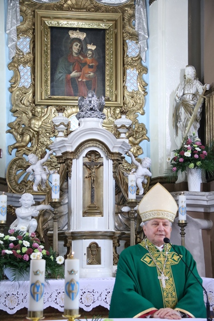 Fot. Ewa Kotowska-Rasiak– Kościół zawsze będzie stał po stronie życia. Nigdy nie zgodzi się na eutanazję i aborcję – mówił bp Edward Janiak, który przewodniczył Mszy św. w Sanktuarium Matki Bożej w Lutyni. Biskup kaliski poświęcił nowy dach na świątyni.
