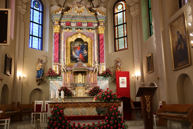 W ołtarzu został umieszczony obraz NMP Wniebowziętej, który znajdował się w starym przedwojennym ołtarzu oraz obraz Matki Bożej Śnieżnej, który do tej pory był ulokowany w bocznej kaplicy, a po renowacji i otrzymaniu nowej ramy postanowiono umieścić go również w ołtarzu głównym. Wota, jakie znajdowały się na tym obrazie oraz srebrne sukienki świadczą o tym, iż wizerunek ten w przeszłości cieszył się wielką czcią wiernych. Obraz uznawany za cudowny jest datowany na 1. poł. XVII w., a przyozdobiony sukienkami z XVIII w.