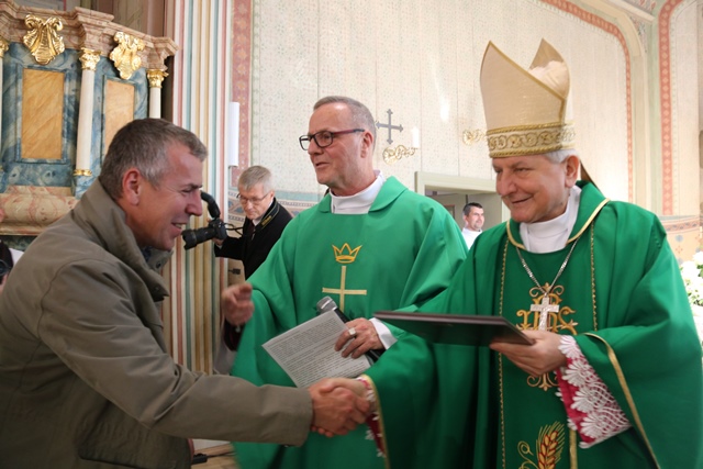 Podczas Mszy św. bp Edward Janiak wręczył podziękowania osobom zaangażowanym w dzieło odnowienia wnętrza świątyni.