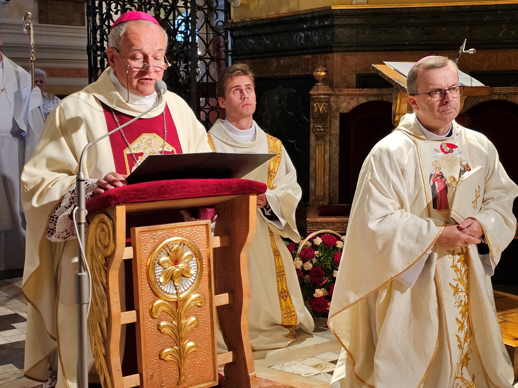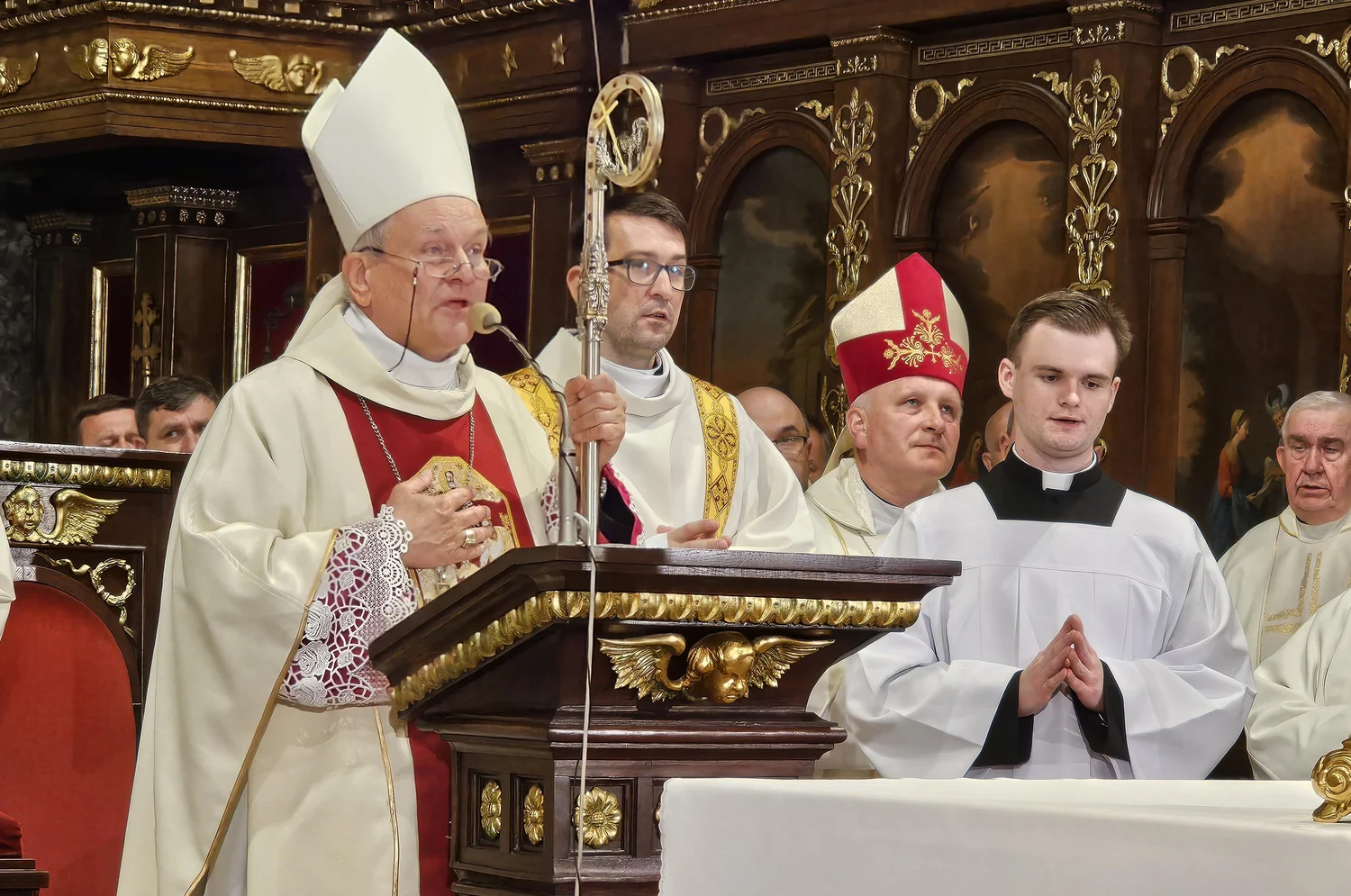 Biskup kaliski Damian Bryl prosił o modlitwę w intencji księży neoprezbiterów, a także o odwagę dla młodych ludzi, żeby potrafili pójść za Bożym powołaniem.