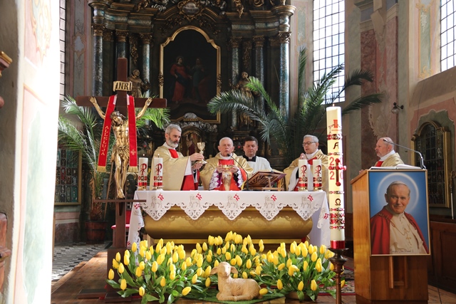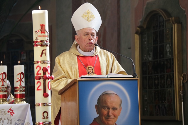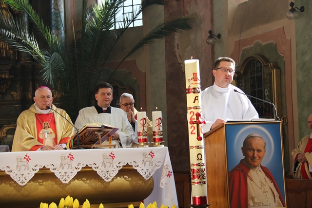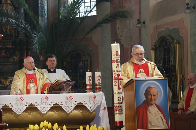 W homilii pierwszy biskup kaliski przypomniał, że święto Miłosierdzia Bożego ustanowił dwadzieścia lat temu św. Jan Paweł II. – Święto Miłosierdzia Bożego to pragnienie Jezusowego Serca, które zostało przekazane Kościołowi i światu przez św. siostrę Faustynę, a spełnił je z wielką radością i poczuciem zaszczytu św. Jan Paweł II. To on ustanowił Święto Miłosierdzia Bożego w drugą Niedzielę Wielkanocy w roku 2000, kiedy na ołtarze wyniósł jako świętą siostrę Faustynę. Niedziela Miłosierdzia ma głosić światu, że Bóg go kocha – stwierdził celebrans.