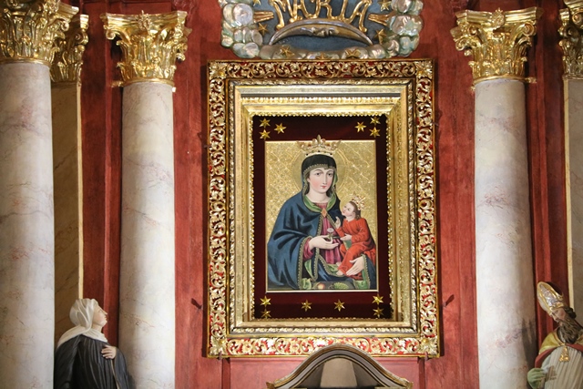 Obraz przedstawia Maryję w półpostaci, podtrzymującą na lewym ramieniu Dzieciątko. Wizerunek ten jest zakrywany na co dzień obrazem Zwiastowania NMP. Obraz Matki Bożej Pocieszenia stanowi przedmiot szczególnego kultu. Był on jednak mocno podniszczony i dlatego w 1968 r. poddany został gruntownej konserwacji. Wtedy też usunięto z niego posrebrzaną sukienkę, dzięki czemu malowidło okazało się oczom wiernych w pełnym blasku.