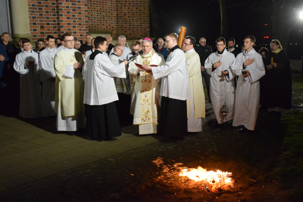 Wspólną modlitwę czuwania przed zmartwychwstaniem Chrystusa, rozpoczął obrzęd poświęcenia ognia i Paschału. Przy jego świetle i zapalonych przez wiernych świec w świątyni odśpiewano Orędzie Paschalne, wyjaśniające symbolikę światła, którym jest Chrystus powstający z mroku śmierci do życia. Następnie wierni wysłuchali rozbudowanej do kilku czytań Liturgii Słowa.