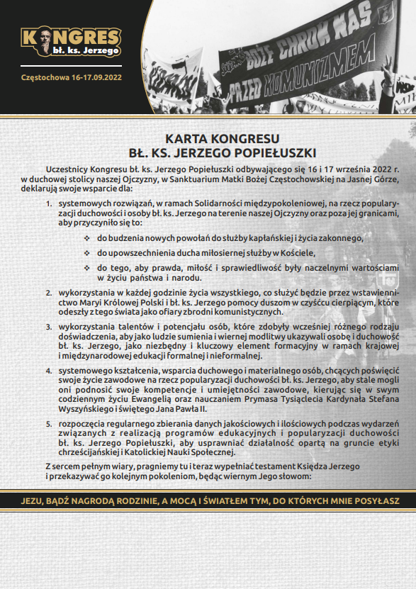 Kongres zakończyło podpisanie Karty Kongresu bł. ks. Jerzego Popiełuszki, będącej zobowiązaniem dla uczestników, aby promować nauczanie ks. Jerzego.