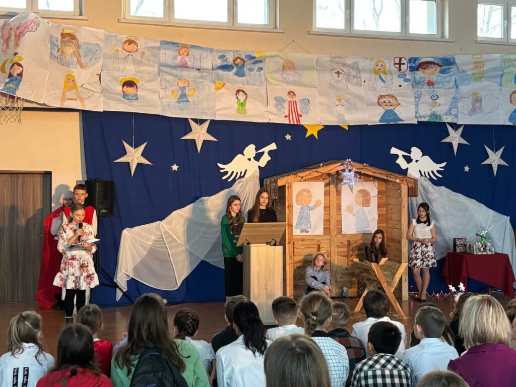 Uczniowie klas 4-8 spotkali się na sali gimnastycznej, która wyglądała „jak przedsionek nieba”. Anioły spoglądały na wychowanków szkoły ze 111 zgromadzonych prac plastycznych. – Dzieci poświęciły dużo czasu i wspólnej pracy, ale efekt ich zaangażowania był tego wart. W tak pięknym wystroju, wśród aniołów i śpiewu kolęd, uczniowie wcielili się w postaci sprzed dwóch tysięcy lat i zaprowadzili wszystkich zgromadzonych do betlejemskiej stajenki – dodał Paweł Dziewiątkowski.