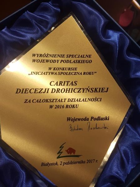 Fot. drohiczyn.caritas.plWyróżnienie specjalne za całokształt działalności w 2016 r. otrzymała w konkursie „Inicjatywa Społeczna Roku” Caritas Diecezji Drohiczyńskiej. Ogłoszenie laureatów i wręczenie nagród odbyło się 2 października 2017 r. w Sali Kolumnowej Urzędu Wojewódzkiego w Białymstoku.