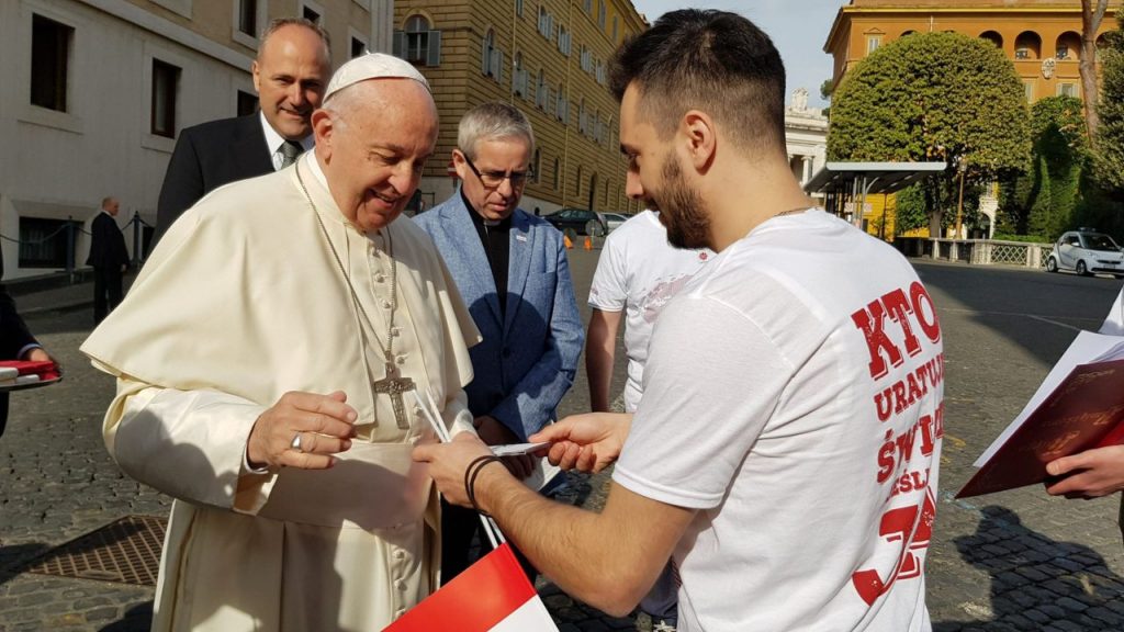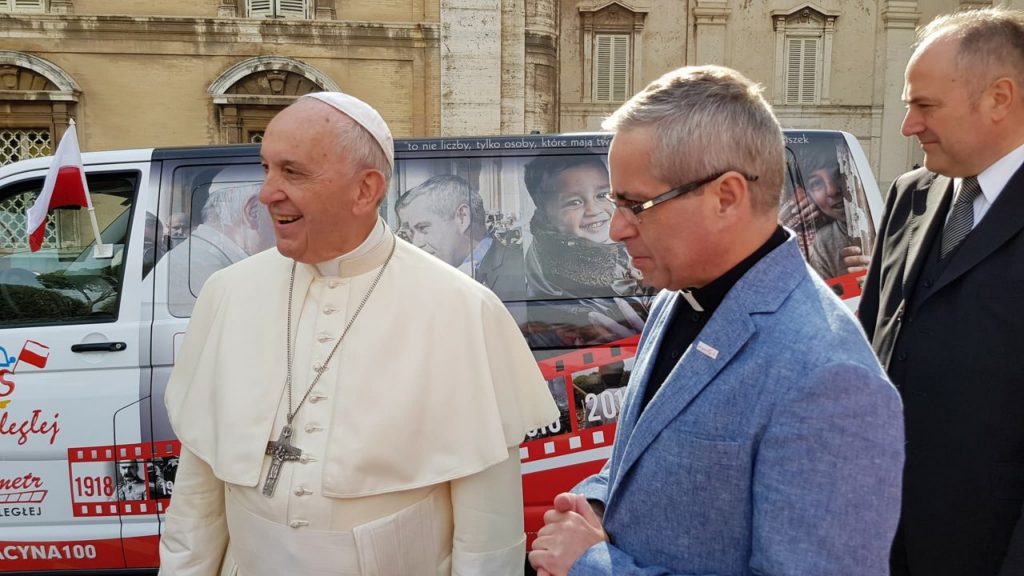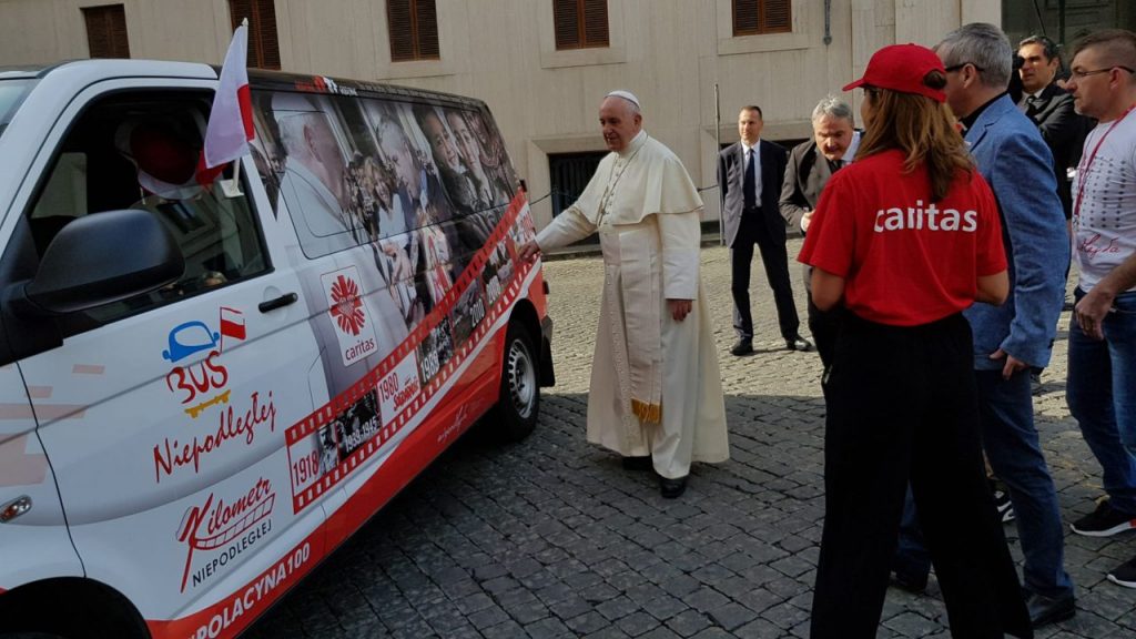 Poranna audiencja, w której wzięli udział: dyrektor Caritas Polska ks. Marcin Iżycki, pracownicy i wolontariusze, a także młodzież z Syrii, miała charakter prywatny. Delegacja wjechała na Plac Świętej Marty Busem, tzw. Mobilną Ambasadą Niepodległej, promującą największe społeczne obchody 100-lecia odzyskania przez Polskę niepodległości.
