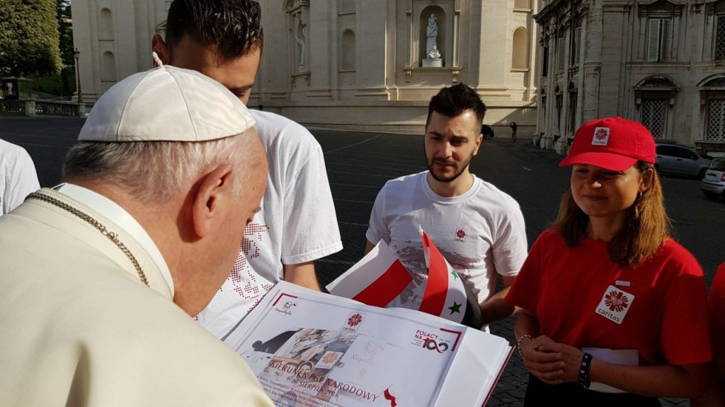Przedstawiciele Caritas Polska przekazali Ojcu Świętemu flagę Polski otrzymaną od Prezydenta RP. Dyrektor Caritas Polska w rozmowie z Ojcem Świętym poinformował o przeżywanych w naszym kraju obchodach związanych ze 100-leciem odzyskania przez Polskę niepodległości. Papież otrzymał też ikonę Madonny z Dzieciątkiem jako dar mieszkańców Syrii.