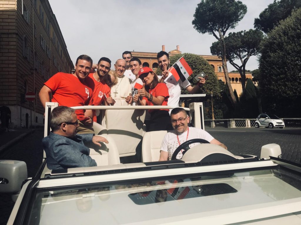 Przedstawiciele Caritas Polska wraz z młodzieżą syryjską wzięli 2 maja udział w dwóch audiencjach u Ojca Świętego. Papież pobłogosławił projekt #Polacyna100 oraz podkreślił, że kampania „Mobilna Ambasada Young Caritas” uwrażliwia na problemy najbiedniejszych, promuje wolontariat i niesie pomoc prześladowanym w Syrii.