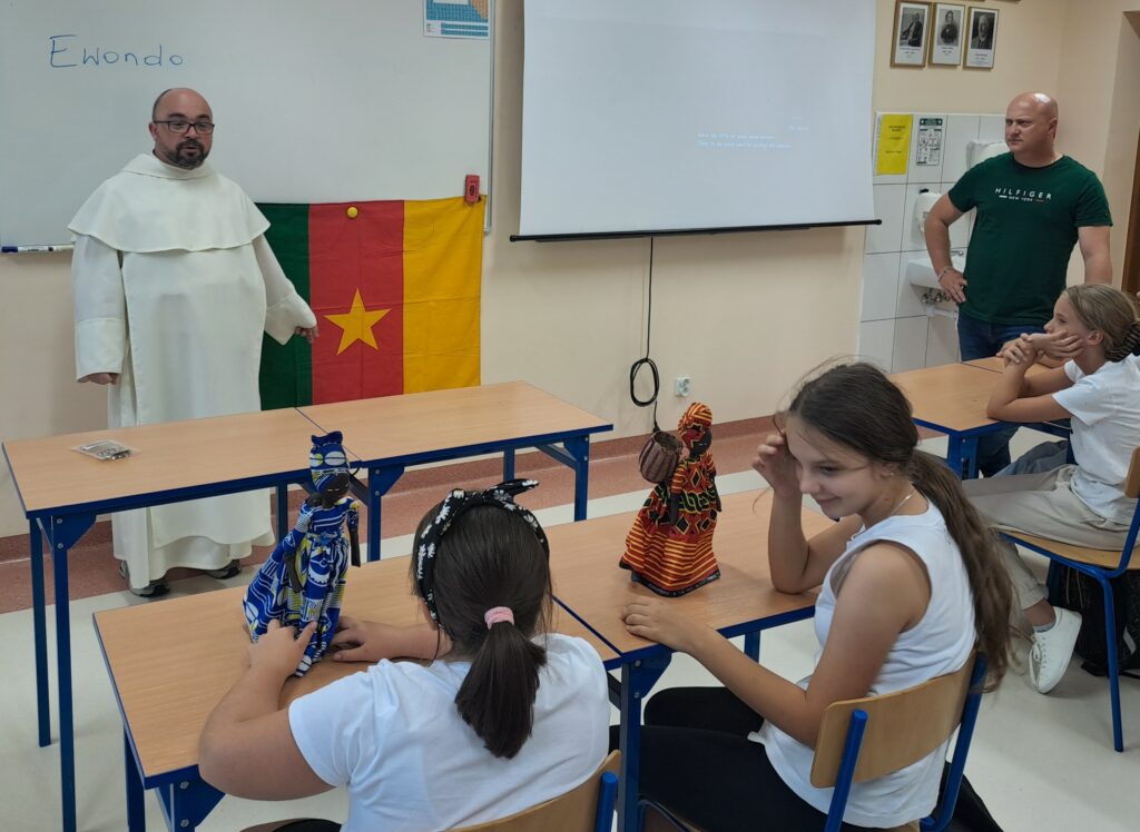 Uczniowie Szkoły Podstawowej nr 1 im. Bohaterów Westerplatte nauczyli się od o. Jeziorskiego jak powiedzieć dzień dobry w miejscowym języku ewondo i języku urzędowym, czyli po francusku, poznali co jedzą ich rówieśnicy w Kamerunie. – Przede wszystkim pamiętajcie, że jedzą jeden posiłek dziennie, sporządzony np. z orzeszków ziemnych, które tam rosną albo danie z manioku. Będąc w szkole na naszej Katolickiej Misji, ze względu liczby dzieci (prawie tysiąc wszystkich uczniów) dwa razy w tygodniu najmłodsi otrzymują dodatkowy posiłek – drożdżówkę, nie mogą się na nią doczekać – przyznawał kapłan.