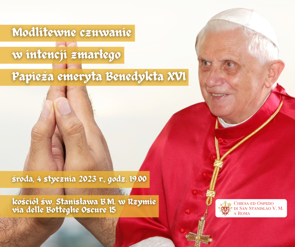 Ks. rektor Paweł Ptasznik oraz wspólnota parafialna zgromadzona przy kościele św. Stanisława B.M. w Rzymie zapraszają Polaków mieszkających w Rzymie oraz polskich pielgrzymów przybywających, by wziąć udział w uroczystościach pogrzebowych Papieża emeryta Benedykta XVI na wspólne czuwanie modlitewne.