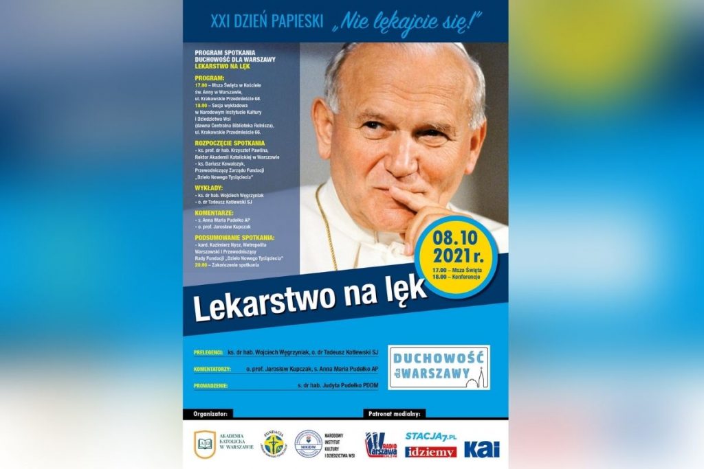 Fot. FDNTW ramach obchodów XXI Dnia Papieskiego, przeżywanego pod hasłem „Nie lękajcie się!”, Fundacja „Dzieło Nowego Tysiąclecia” organizuje konferencję naukową, w ramach organizowanego przez Akademię Katolicką w Warszawie cyklu spotkań „Duchowość dla Warszawy”, pod hasłem „Czy jest lekarstwo na lęk?”. Wydarzenie, realizowane we współpracy z Akademią Katolicką w Warszawie, odbywa się pod auspicjami ks. kard. Kazimierza Nycza, metropolity warszawskiego. Partnerem wydarzenia jest Stowarzyszenie Absolwentów „Dzieło”.