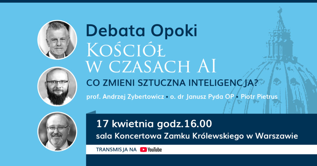 Materiały organizatorówDrugiego dnia XXXI Targów Wydawców Katolickich, 17 kwietnia, w sali koncertowej Zamku Królewskiego o godz. 16 odbędzie się debata Opoki „Kościół w czasach AI”. Z pytaniem, jak sztuczna inteligencja zmieni Kościół i nasze społeczeństwo zmierzą się trzej eksperci: prof. Andrzej Zybertowicz, o. dr Janusz Pyda OP i redaktor naczelny telewizji EWTN Piotr Pietrus. Debata odbędzie się w kontekście zapowiadanej przez papieża Leona XIV nowej encykliki. Transmisja także na YouTube Opoki.