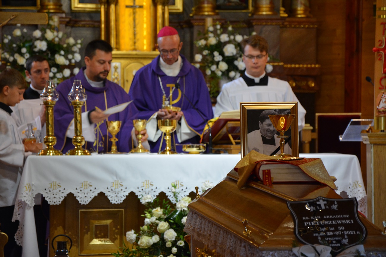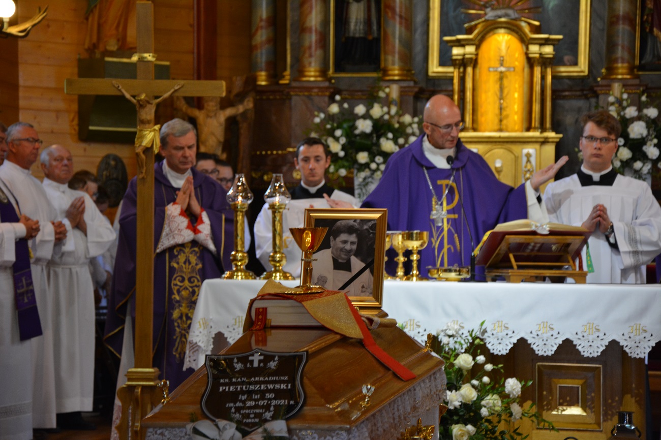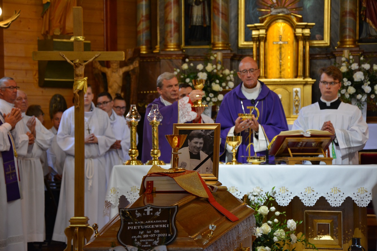 Fot. Renata RóżańskaW czwartek 5 sierpnia 2021 r. zakończyły się dwudniowe uroczystości pogrzebowe tragicznie zmarłego ks. kan. Arkadiusza Pietuszewskiego. W kościele pw. Matki Bożej Szkaplerznej, w Studzienicznej Mszy św. przewodniczył i homilię wygłosił bp Adrian Galbas, biskup pomocniczy diecezji ełckiej w koncelebrze z bp. Tadeuszem Bronakowskim, biskupem pomocniczym diecezji łomżyńskiej i bardzo licznie przybyłych kapłanów z diecezji ełckiej oraz z różnych parafii w Polsce.