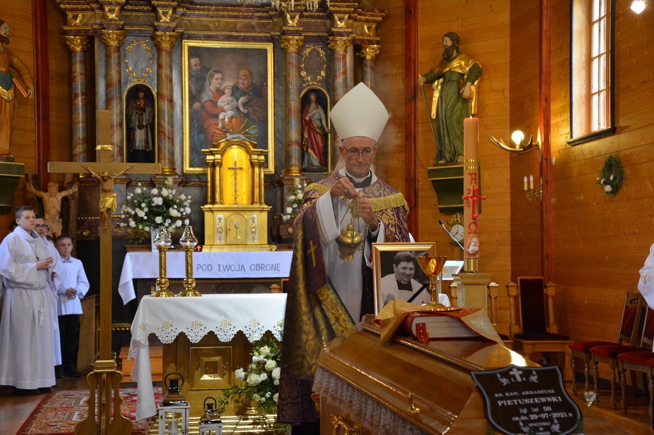 Trumna z ciałem śp. ks. Arkadiuszem Pietuszewskim została złożona na cmentarzu parafialnym w Studzienicznej, gdzie przez ostatnie lata był proboszczem i kustoszem Sanktuarium Matki Bożej Studzieniczańskiej.