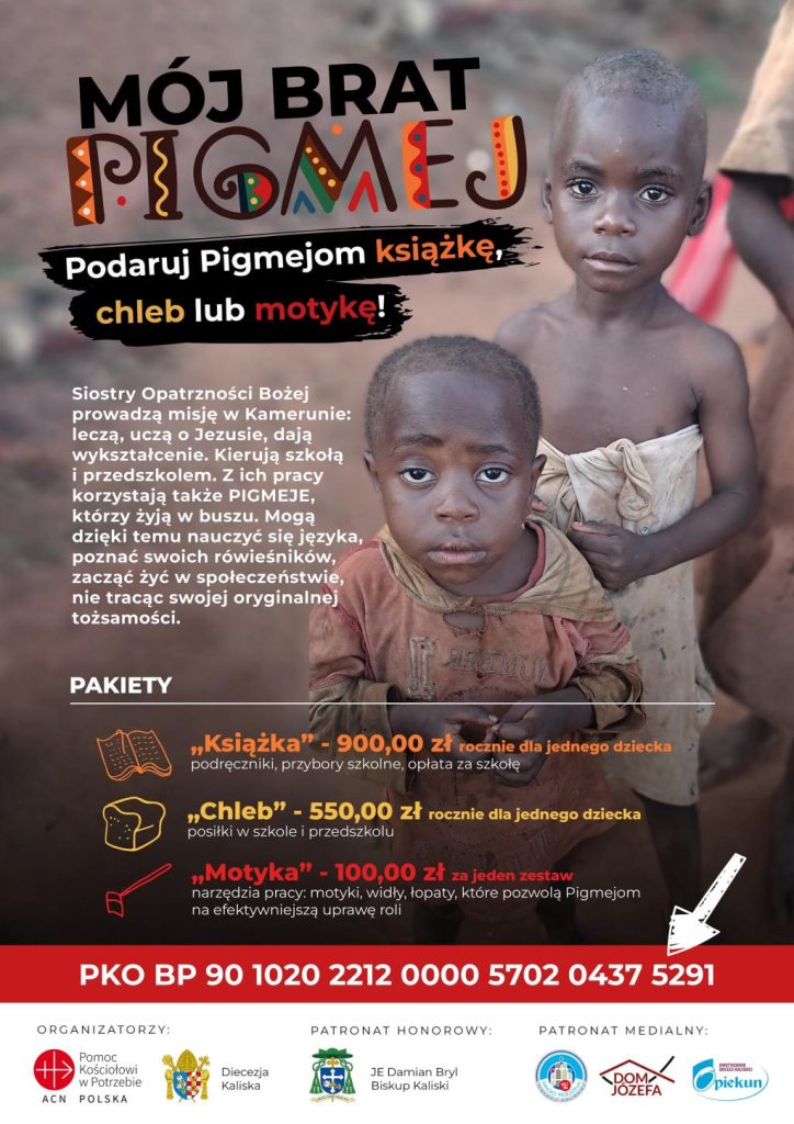 Diecezja kaliska we współpracy z Papieskim Stowarzyszeniem Pomoc Kościołowi w Potrzebie bierze udział w akcji „Mój brat Pigmej”. Do sponsorowania pakietów edukacyjnych, żywieniowych i rolniczych dla Pigmejów w Kamerunie zachęca diecezjan biskup kaliski Damian Bryl.