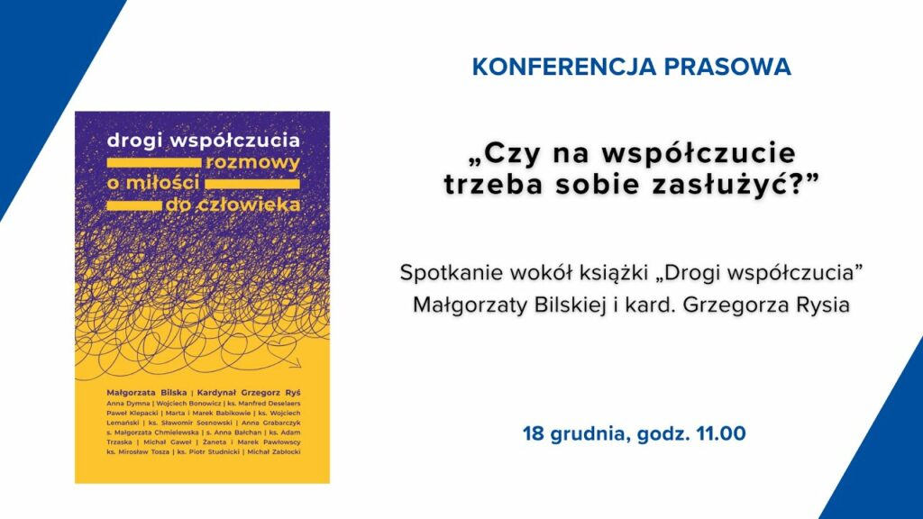 Katolicka Agencja Informacyjna oraz Wydawnictwo Święty Wojciech Dom Medialny zapraszają na konferencję „Czy na współczucie trzeba sobie zasłużyć? Książka o tym, że od-ruch serca jest ważniejszy niż pobożny rytuał”. Okazją do rozmowy jest książka „Drogi współczucia” Małgorzaty Bilskiej i kard. Grzegorza Rysia. Wydarzenie odbędzie się 18 grudnia w Warszawie.