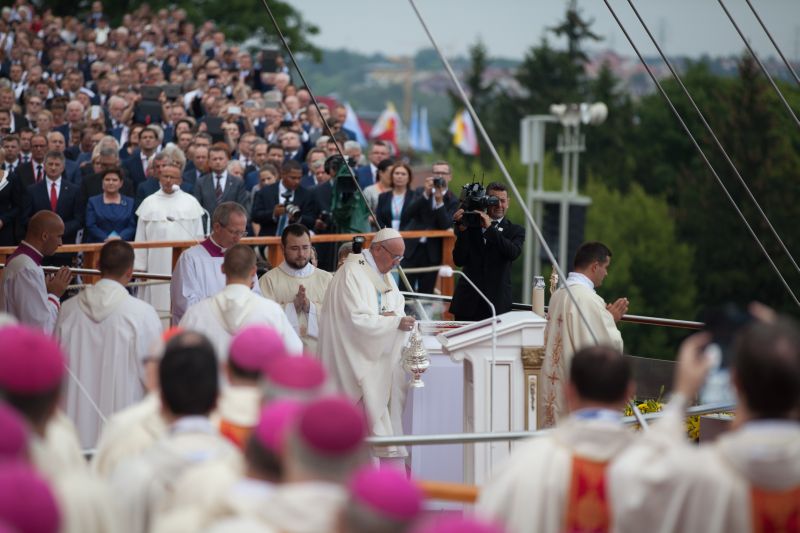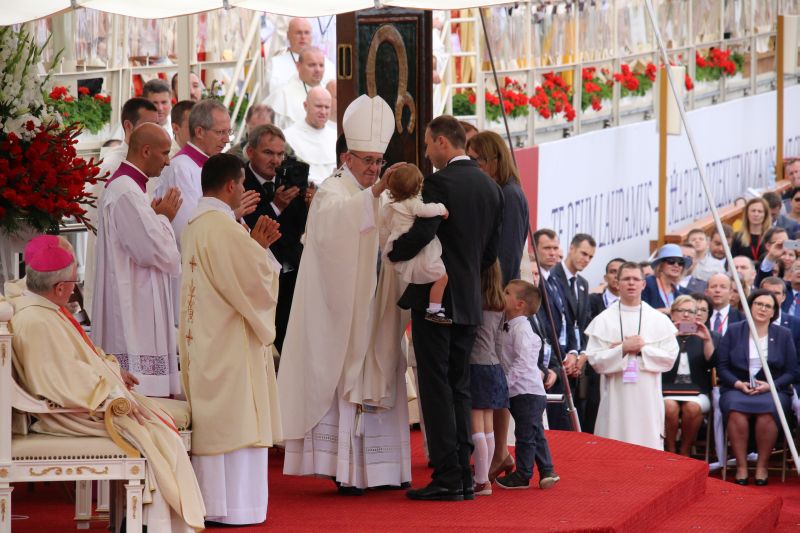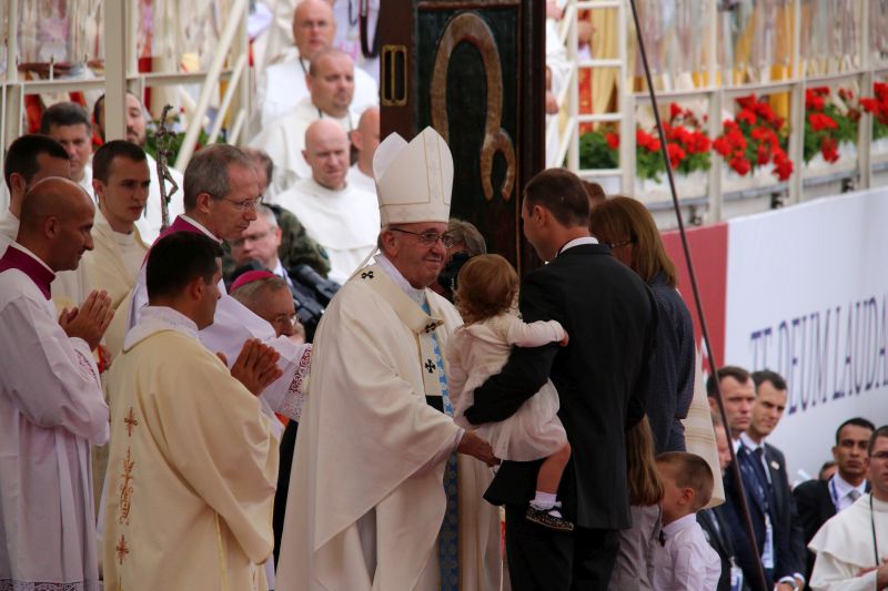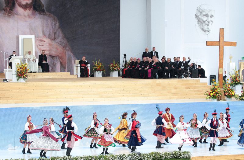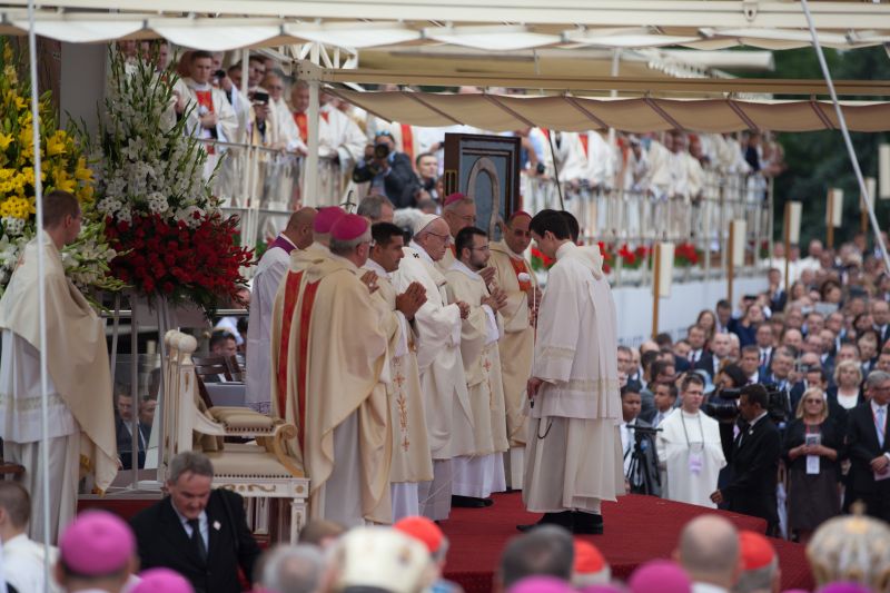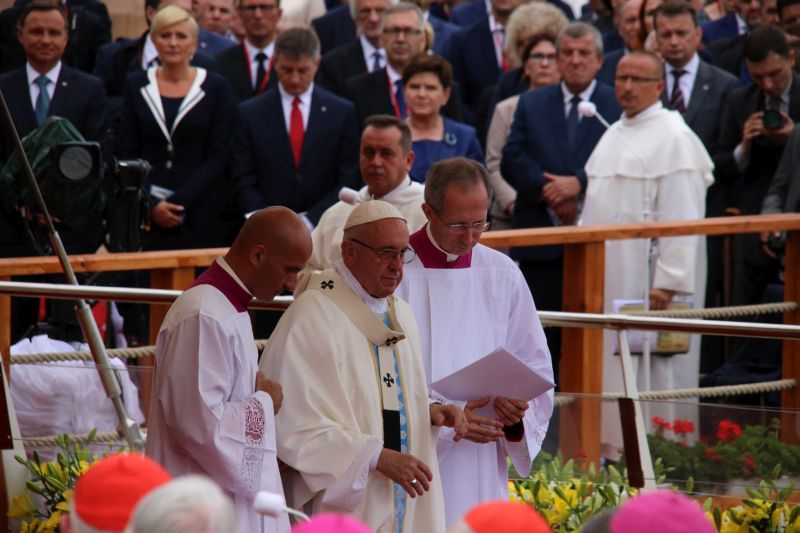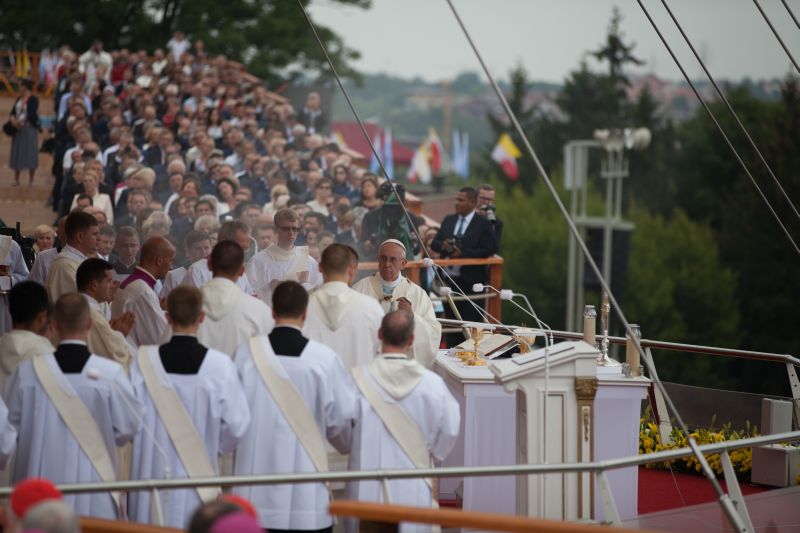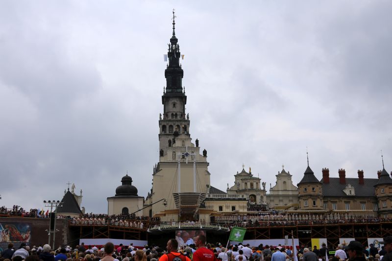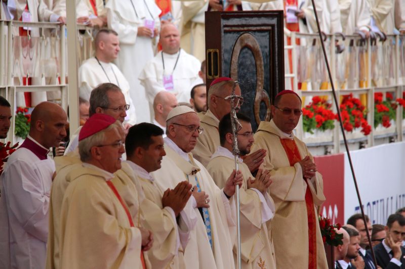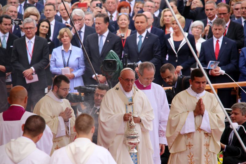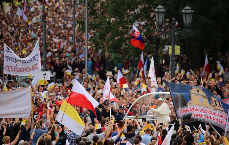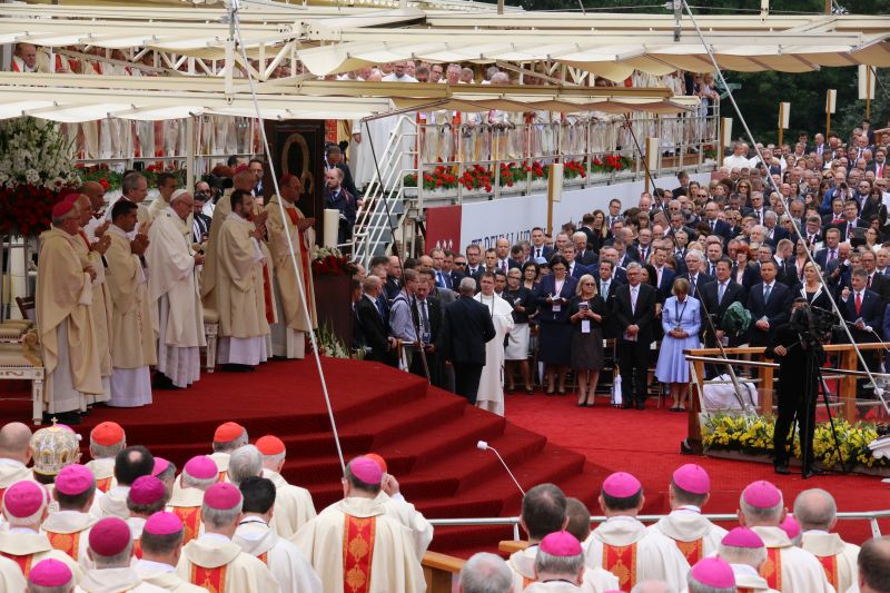 Fot. Karol Porwich / KAIOdwiedziny sióstr prezentek i kard. Franciszka Macharskiego w szpitalu w Krakowie, Msza św. dziękczynna za 1050 lat chrześcijaństwa w Polsce na Jasnej Górze, ceremonia powitania przez młodzież na krakowskich Błoniach i kolejne spotkanie w „Oknie Papieskim” ze zgromadzonymi na placu przed Domem Arcybiskupim złożyły się na drugi dzień wizyty Franciszka w Polsce z okazji 31. Światowych Dni Młodzieży w Krakowie – 28 lipca.