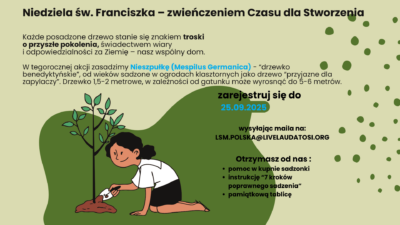 Do udziału w akcji zaproszone są parafie, wspólnoty zakonne, szkoły, samorządy, organizacje społeczne i ekologiczne oraz osoby indywidualne. Rejestracja uczestników trwa do 25 września 2025 r. Zgłoszenia można przesyłać na adres: LSM.polska@livelaudatosi.org z dopiskiem „Drzewko Nadziei Papieża Franciszka”. Każdy uczestnik otrzyma instrukcję sadzenia wraz z wysyłką sadzonki lub zwrotem kosztów jej zakupu oraz pamiątkową tablicę.