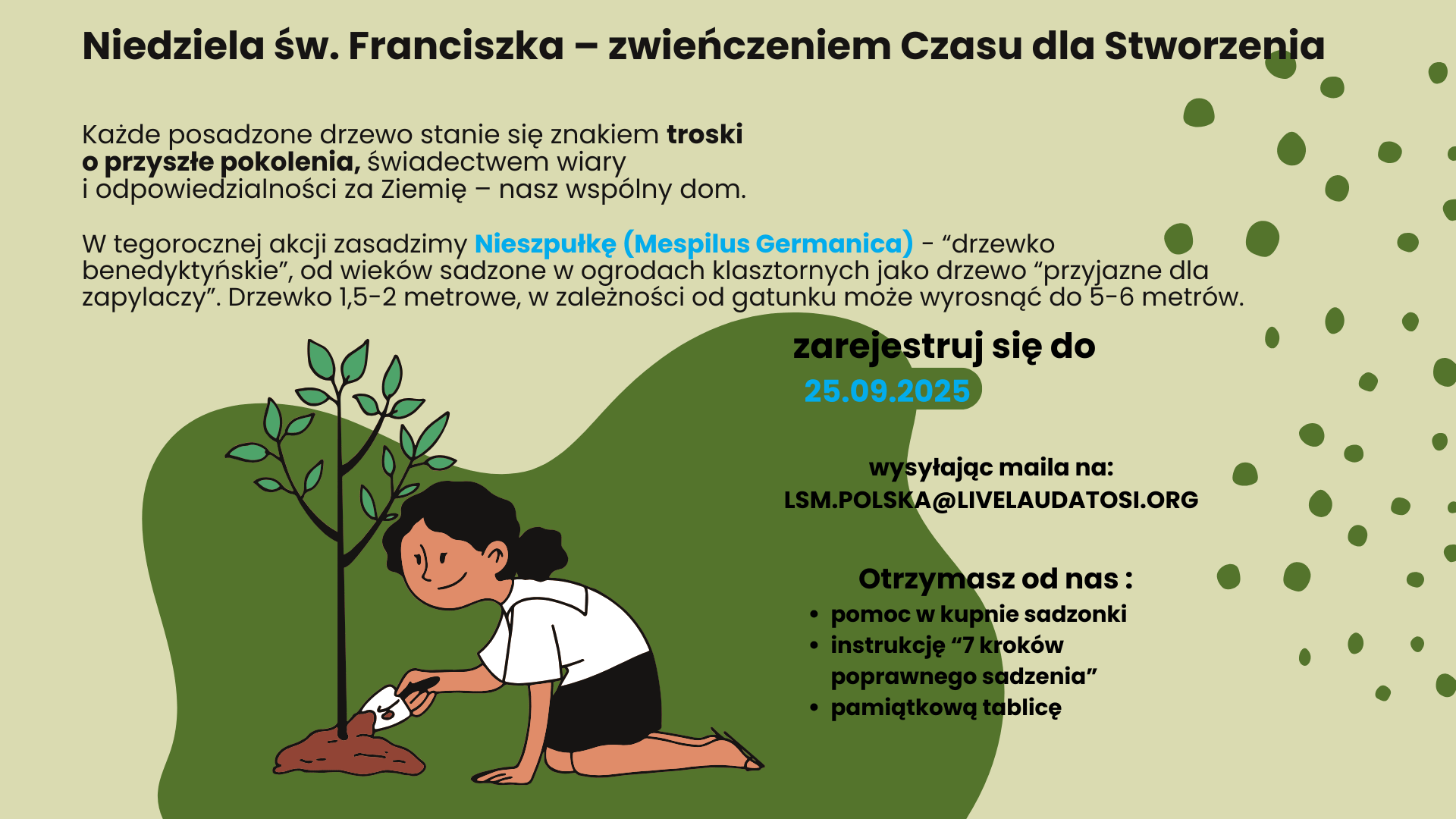Do udziału w akcji zaproszone są parafie, wspólnoty zakonne, szkoły, samorządy, organizacje społeczne i ekologiczne oraz osoby indywidualne. Rejestracja uczestników trwa do 25 września 2025 r. Zgłoszenia można przesyłać na adres: LSM.polska@livelaudatosi.org z dopiskiem „Drzewko Nadziei Papieża Franciszka”. Każdy uczestnik otrzyma instrukcję sadzenia wraz z wysyłką sadzonki lub zwrotem kosztów jej zakupu oraz pamiątkową tablicę.