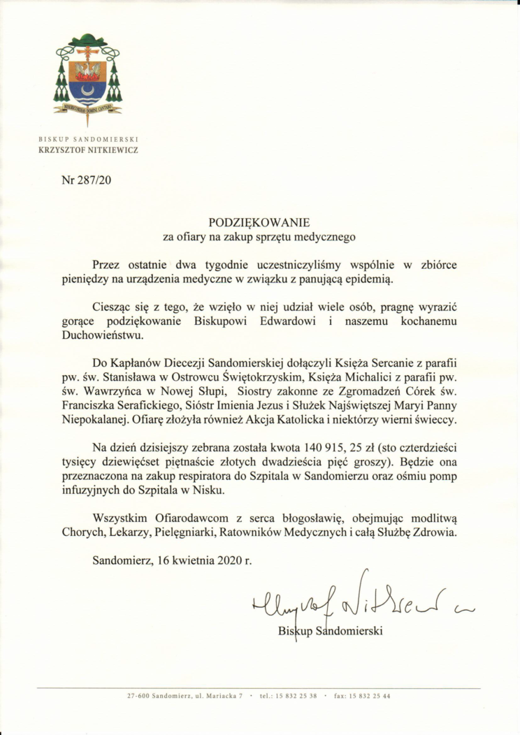 Duchownym z diecezji sandomierskiej, którzy w ciągu dwóch tygodni przekazali ofiary pieniężne w kwocie blisko 141 tys. zł, podziękował bp Krzysztof Nitkiewicz 16 kwietnia w specjalnym piśmie. Pieniądze przekazane zostaną na zakup sprzętu medycznego – respiratora i pompy infuzyjnych.