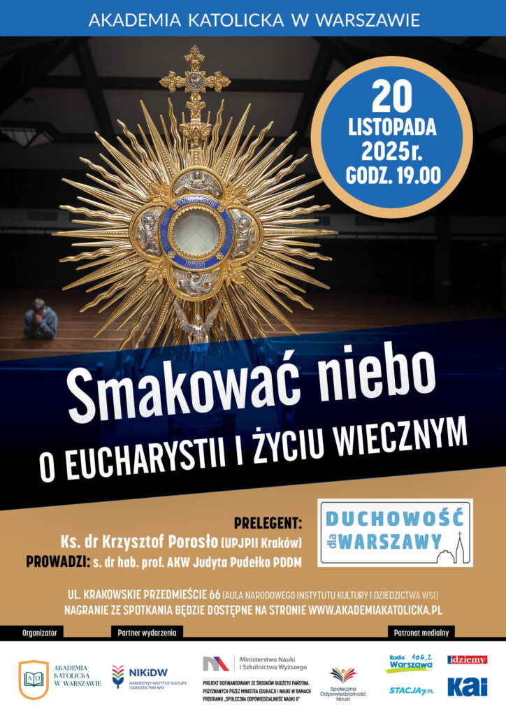 Wobec tych i podobnych pytań staniemy podczas kolejnego wykładu z cyklu „Duchowość dla Warszawy”, organizowanego przez Akademię Katolicką w Warszawie we współpracy z Narodowym Instytutem Kultury i Dziedzictwa Wsi. Wykład zatytułowany „Smakować Niebo. O Eucharystii i Życiu Wiecznym” wygłosi ks. dr Krzysztof Porosło, UP JPII, który zaprasza w następujący sposób: „Najpierw zatrzymamy się przy roli zmysłów w liturgii, pokazując, jak uczestnictwo w Eucharystii angażuje całego człowieka. Nie bez powodu św. Tomasz z Akwinu w hymnie Adoro te devote mówiąc o odkrywaniu realnej obecności Chrystusa przywołał wszystkie zmysły człowieka. W drugiej części spróbujemy wyjaśnić, co znaczy, że Eucharystia jest „przedsmakiem nieba” i „zadatkiem życia wiecznego” – czyli jak już teraz uczestniczymy w tym, co dopiero ma się objawić w pełni. Będzie to próba uchwycenia, jak w zwyczajnych gestach liturgii ukrywa się nieustannie otwarte przejście ku wieczności”.