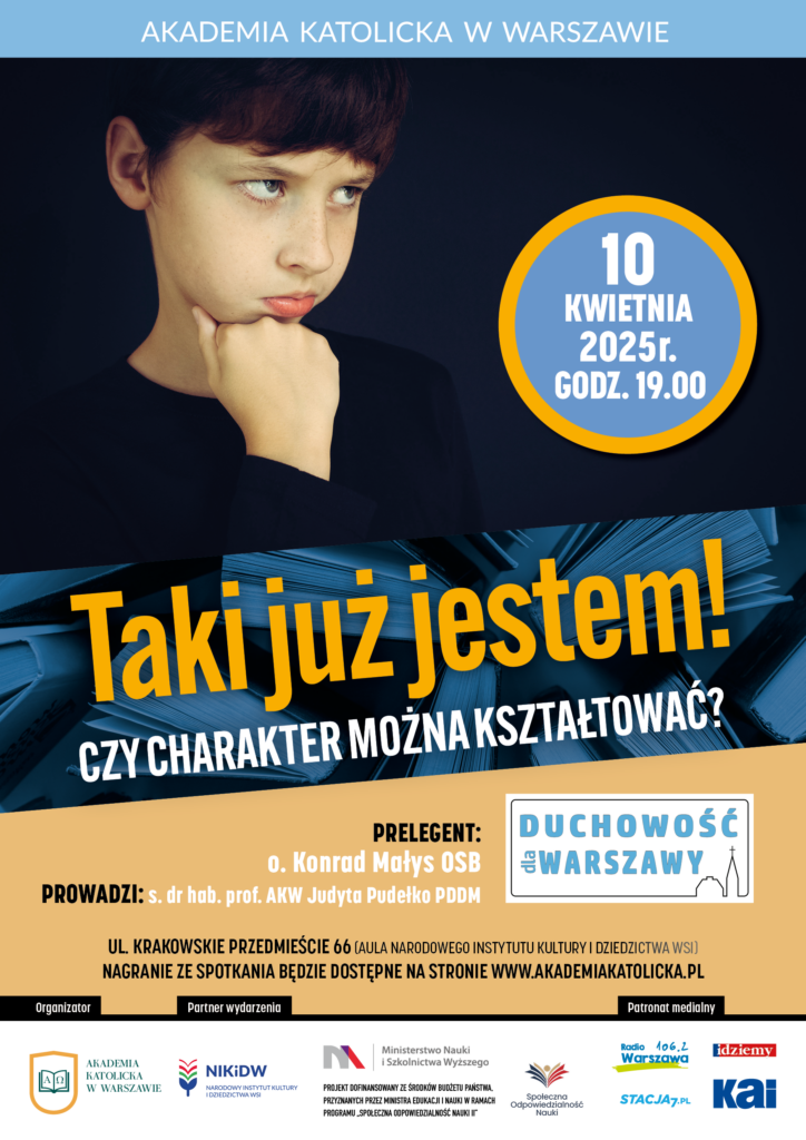 Wobec tych i podobnych pytań staniemy podczas kolejnego wykładu z cyklu „Duchowość dla Warszawy”, organizowanego przez Akademię Katolicką w Warszawie we współpracy z Narodowym Instytutem Kultury i Dziedzictwa Wsi. Wykład zatytułowany „Taki już jestem! Czy charakter można kształtować?” wygłosi o. Konrad Małys OSB.