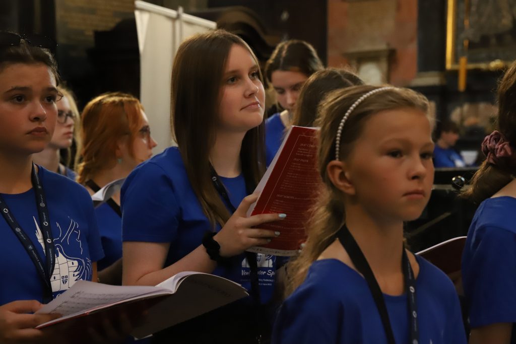 Witając zgromadzonych w bazylice Mariackiej uczestników XI Kongresu Polskiej Federacji Pueri Cantores ks. Dariusz Raś zwrócił uwagę, że to właśnie ten charakterystyczny dla Krakowa kościół został wpisany w logo wydarzenia. Podziękował jego autorce Agacie Drobniak, byłej chórzystce krakowskiej Psalmodii. Proboszcz parafii Mariackiej, przywołując słowa św. Jana Pawła II podkreślił, że „sztuka – słowo, muzyka, pieśń – wznoszą nasze serca ku górze, uczą człowieka pokojowego tworzenia wspólnoty w każdym wymiarze”. – Niech Królowa Pokoju doprowadzi nas razem w tych chwilach do potrzebnej harmonii serca i wymodli nam pokój na ziemi, zwłaszcza w ziemii ukraińskiej. Niech Ona sprawi, wsparta modlitwą, abyśmy każdego dnia byli apostołami pokoju Bożego tam, gdzie żyjemy – mówił na początku nabożeństwa ks. Dariusz Raś.
