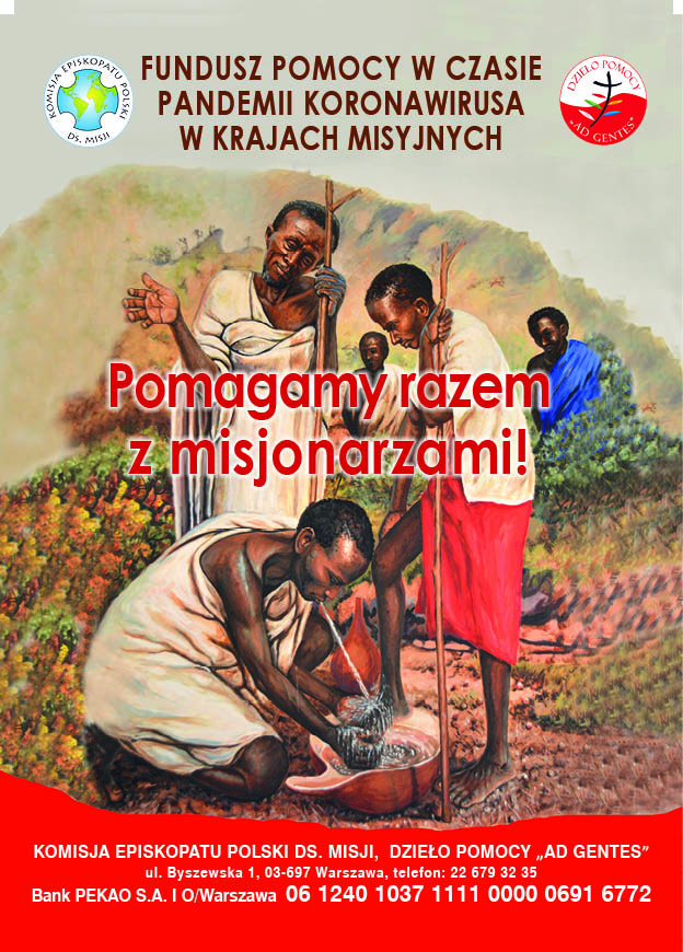 Ofiarę można złożyć również za pośrednictwem przelewu na konto Dzieła Pomocy „Ad Gentes”: Bank PeKaO S.A. I O. w Warszawie 66 1240 1037 1111 0010 1498 4506 z dopiskiem: „Pandemia”.