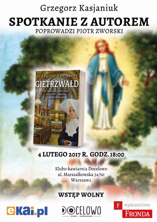 Dziś, 4 lutego (sobota) o godz. 18:00, w Klubo-kawiarnia Docelowo na ul. Marszałkowskiej 34/50 odbędzie się spotkanie wokół najnowszej książki Grzegorza Kasjaniuka – „Gietrzwałd. 160 objawień Matki Boskiej dla Polski i Polaków na trudne czasy”. Spotkanie poprowadzi Piotr Zworski. Wstęp wolny. Więcej o spotkaniu na Facebooku . REPORTERSKIE ŚLEDZTWO Gietrzwałd ze względu na niezwykłe wyciszenie jest nieporównywalny z Fatimą, […]