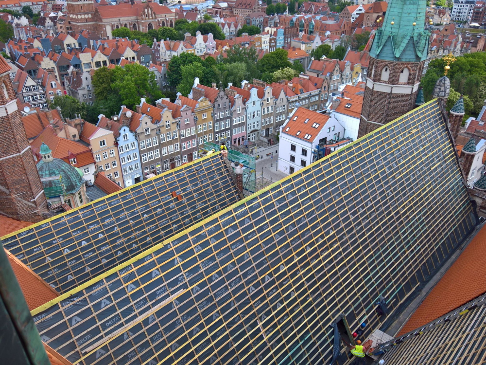 – Jakiś czas temu nasza firma, Dorken Delta, zajmowała się dostarczaniem rozwiązań do renowacji Bazyliki Mariackiej w Gdańsku. Jest to obiekt zabytkowy, w którym podjęto dosyć kompleksową renowację, dotyczącą również dachu. Warto zaznaczyć, że jest jeden z większych dachów wśród obiektów sakralnych w Polsce. Po renowacji ten dach zaczął żyć na nowo, nabrał zupełnie nowej funkcjonalności. Wspomnę też, że wymagania co do renowacji takich dużych, kubaturowych, zabytkowych oraz sakralnych obiektów są dosyć wysokie i często przewyższające wymagania dotyczące innych obiektów. Przede wszystkim konieczne jest zastosowanie materiałów oferujących duże bezpieczeństwo, w tym bezpieczeństwo ogniowe. Chodzi o to, aby w przypadku sytuacji zagrożenia, zastosowane materiały nie brały udziału w pożarze, nie rozprzestrzeniały ognia.