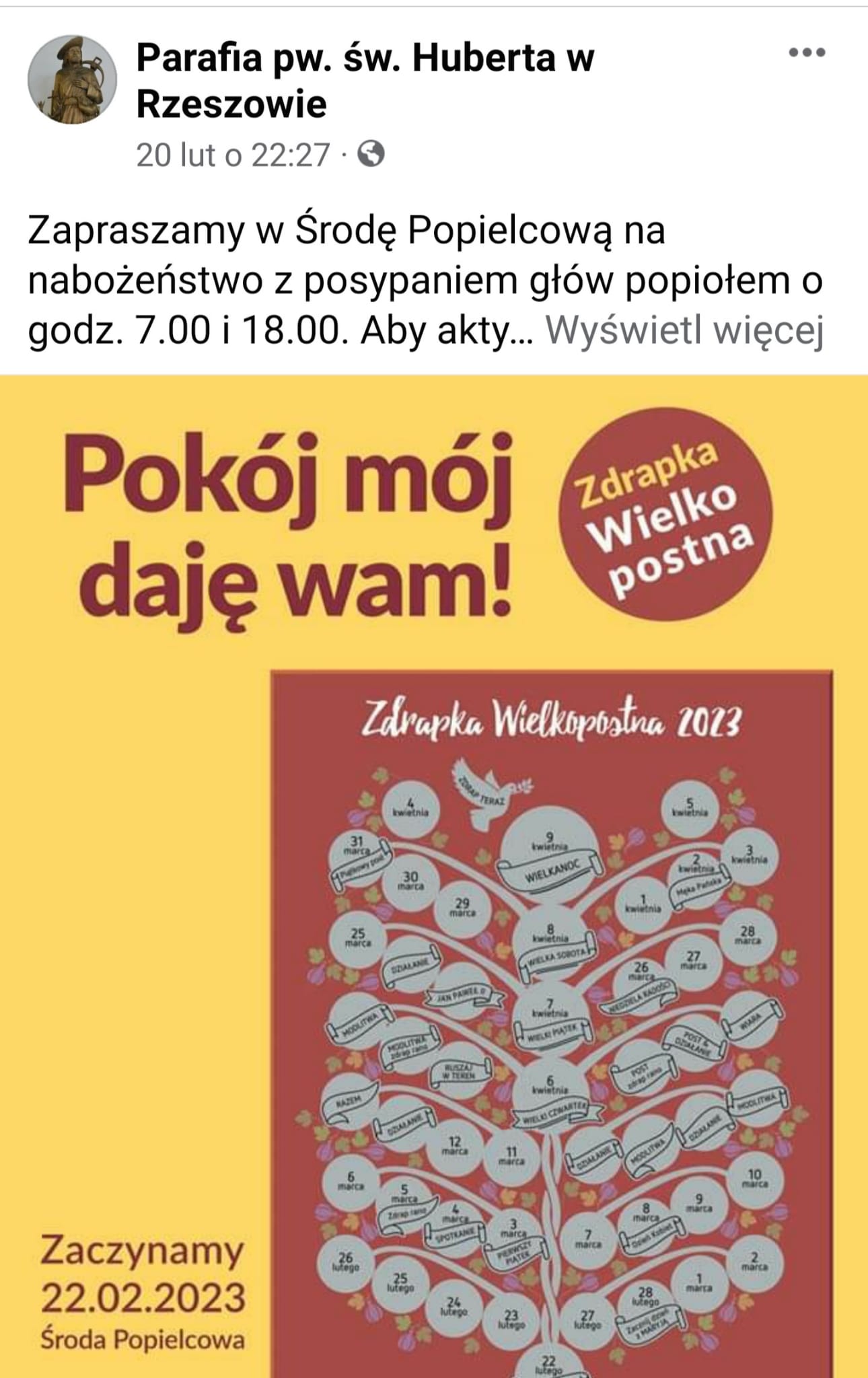 - 3 stycznia 2023 roku została założona strona parafii na Facebooku. Głównym celem była szersza komunikacja w ramach wspólnoty parafialnej, informowanie o wydarzeniach, działaniach i inicjatywach podejmowanych w parafii. Dodatkowo strona FB ma wzmacniać i jednoczyć wspólnotę parafii. Nazwa strony na FB to Parafia pw. św. Huberta w Rzeszowie. Pierwszy post ukazał się 4 stycznia i były to życzenia noworoczne ks. proboszcza Józefa Muchy. Wpis spotkał się z bardzo licznym pozytywnym odbiorem (305 polubień). Obecnie strona liczy 188 polubień i 236 obserwujących. Poza wydarzeniami bieżącymi co tydzień publikowane są ogłoszenia parafialne.
