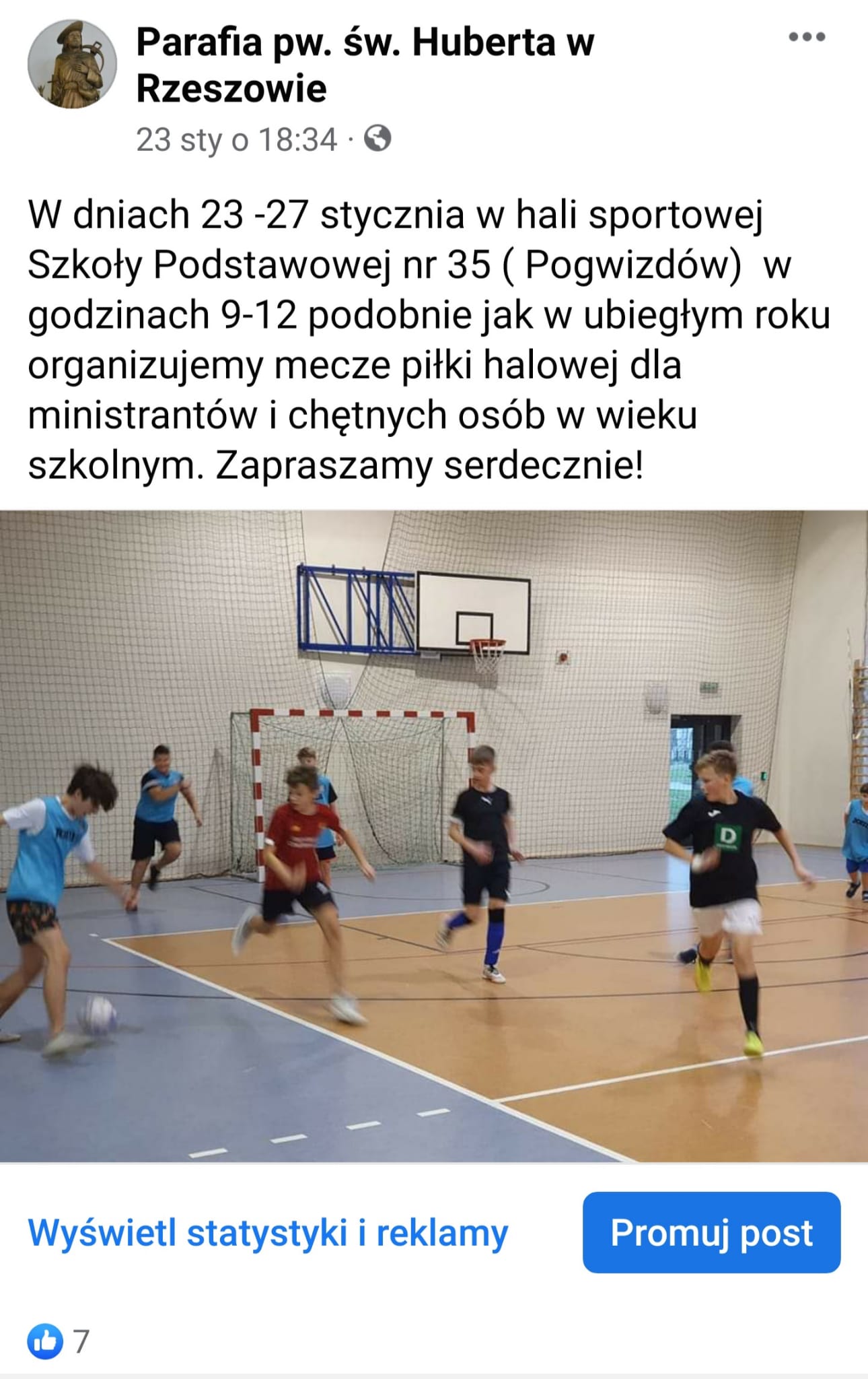 - Od 23 do 27 stycznia w ramach ferii ks. proboszcz zorganizował mecze piłki halowej dla ministrantów i chętnych chłopców. Zajęcia trwały od godz. 9 do 12. Co roku w ferie odbywają się mecze piłki halowej a w wakacje organizowana jest WSB – Wakacyjna Szkoła Biblijna, w czasie której odbywają się gry i zabawy na świeżym powietrzu oraz wycieczki piesze.