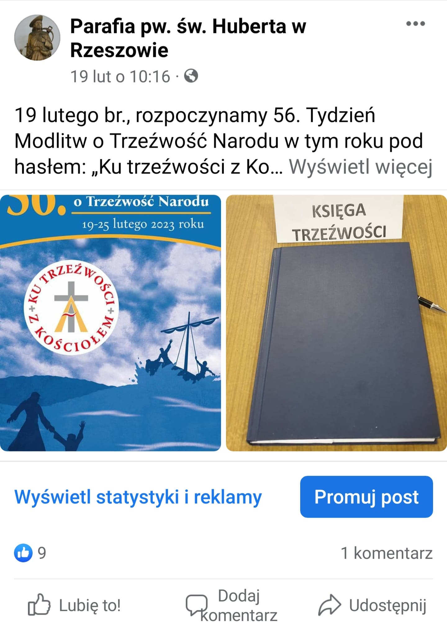 Od 19 do 25 lutego w czasie mszy św. modlono się o trzeźwość narodu. Wystawiona została również parafialna księga trzeźwości, w której można była wpisać w ramach wielkopostnych postanowień abstynencje od alkoholu i innych używek, jako dar duchowy w intencji osób uzależnionych w naszych rodzinach i parafii. To już tradycja w okresie Wielkiego Postu.