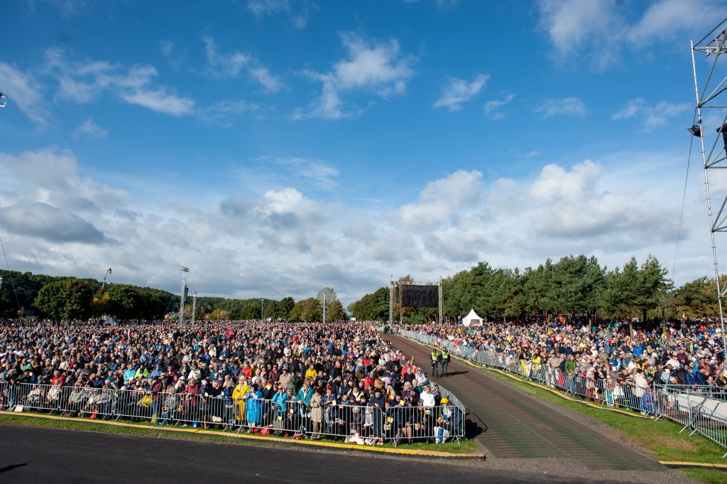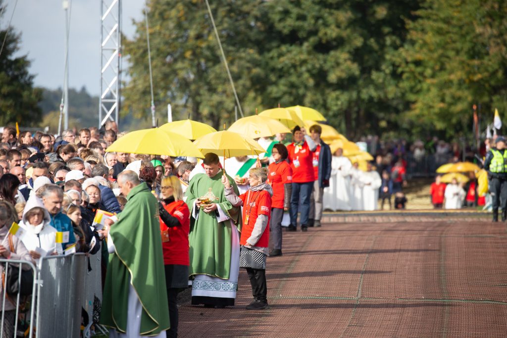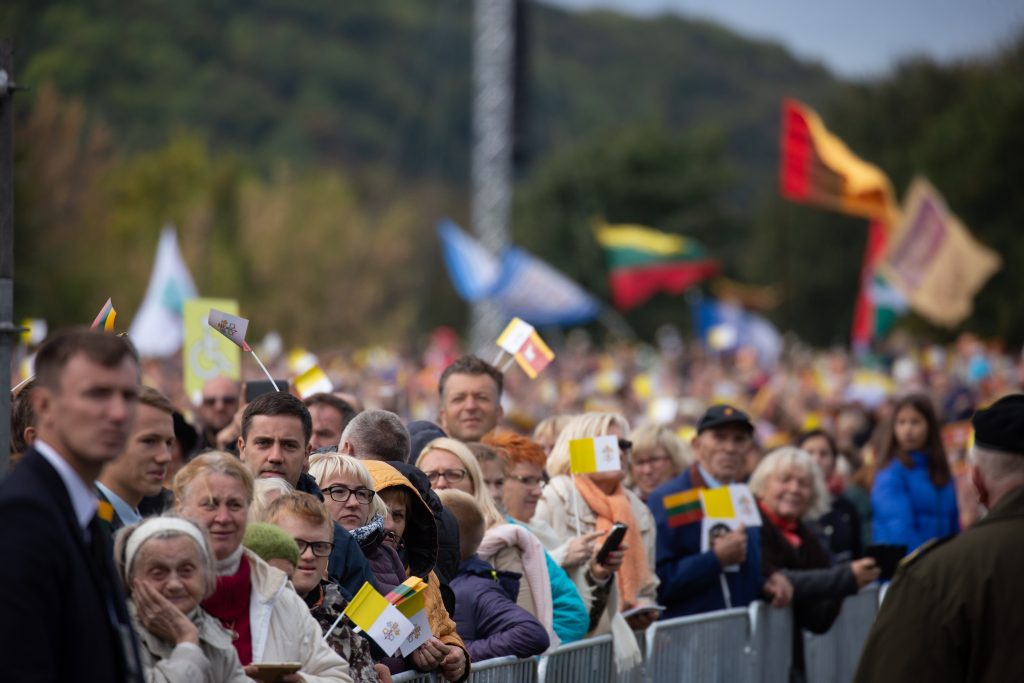 Przed Mszą św. papież objechał w papamobile sektory na placu celebry entuzjastycznie witany przez zgromadzonych, którzy mimo ziemnej i wietrznej pogody czekali tam od świtu. Wśród tłumów wiernych widać było dużo młodych i rodzin z małymi dziećmi. Eucharystia sprawowana była po łacinie, a czytania mszalne po litewsku. Papież posługiwał się krzyżem (pastorałem) Jana Pawła II, tym samym, który towarzyszył mu podczas słynnej pielgrzymki na Litwę sprzed 25 lat.