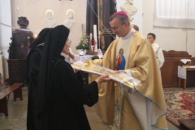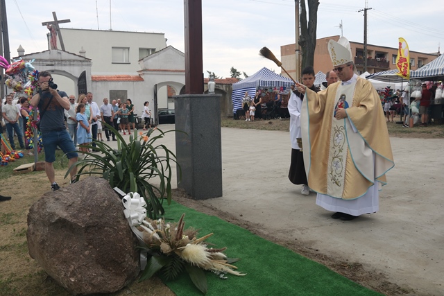 Przed Mszą św. bp Damian Bryl poświęcił pamiątkowy obelisk znajdujący się przed kościołem klasztornym.