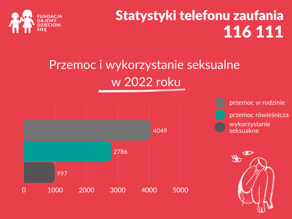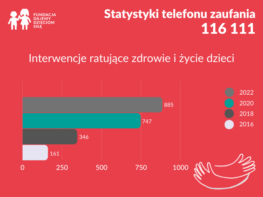 Ze statystyk 116 111 – telefonu zaufania dla dzieci, prowadzonego przez Fundację Dajemy Dzieciom Siłę, wyłania się smutny obraz rzeczywistości dzieci i nastolatków w Polsce. Każdego dnia ponad 19 młodych osób dzwoniło i pisało w sprawie myśli, zamiarów i prób samobójczych. Blisko 30 osób dziennie mówiło o lękach i niepokoju, które nie pozwalają im normalnie funkcjonować, a 9 osób o samookaleczeniach, które są dla nich jedynym sposobem na poradzenie sobie z emocjonalnym bólem. Dodatkowo w 2022 roku konsultanci linii 116 111 podjęli najwięcej, bo aż 885, interwencji ratujących życie lub zdrowie dzieci. To blisko 2,5 interwencji dziennie.