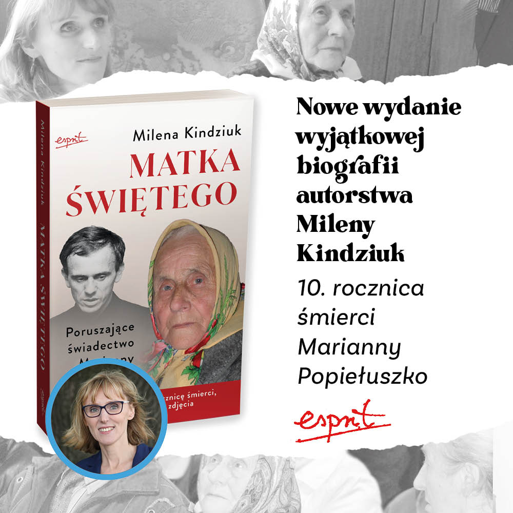 W tym roku mija 10 lat od śmierci wyjątkowej kobiety – Marianny Popiełuszko. Milena Kindziuk, autorka fascynującej biografii pt. „Matka Świętego” przez wiele lat badała i odkrywała dokumenty oraz świadectwa ustne dotyczące życia i męczeńskiej śmierci błogosławionego księdza Jerzego Popiełuszki. W najnowszym wydaniu książki autorka przytacza nowe fakty, które odkryła na przestrzeni ostatnich lat, prezentuje świadectwo wnuka Marianny Popiełuszko – pana Marka oraz liczne niepublikowane wcześniej fotografie. Książka została wydana nakładem Wydawnictwa Esprit.