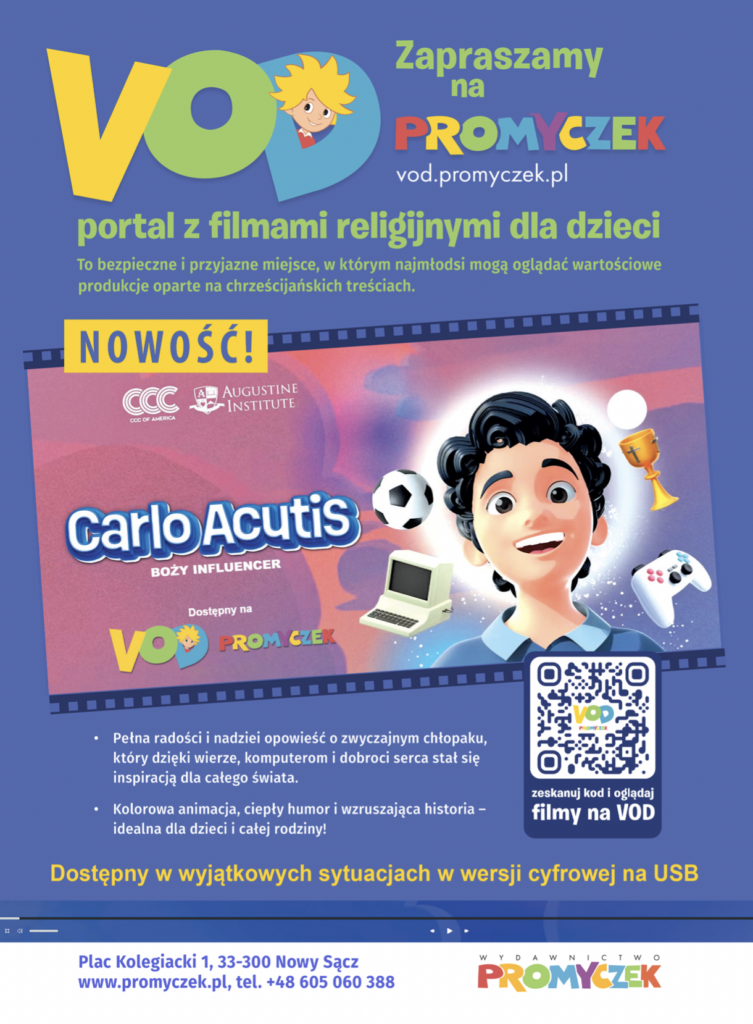 Dzięki wcześniejszym kontaktom Wydawnictwa PROMYCZEK z CCC o America na kanonizację została przygotowana również polska wersja językowa BOŻEGO INFLUENSERA, którą na zlecenie wydawnictwa PROMYCZEK zrealizowało studio VSI – Warszawa. Od dnia kanonizacji film dostępny jest na platformie streamingowej https://vod.promyczek.pl/  i cieszy się dużą popularnością. Warto dodać, że na portalu VOD dostępnych jest ponad 200 filmów religijnych, które stanowią atrakcyjną pomoc w katechizacji dzieci. Oprócz płatnych treści, które dostępne są po wykupieniu abonamentu na portalu dostępnych jest dużo treści darmowych np. cała seria O ŚWIĘTYCH DLA DZIECI oraz wszystkie teledyski zespołu Promyczki Dobra.