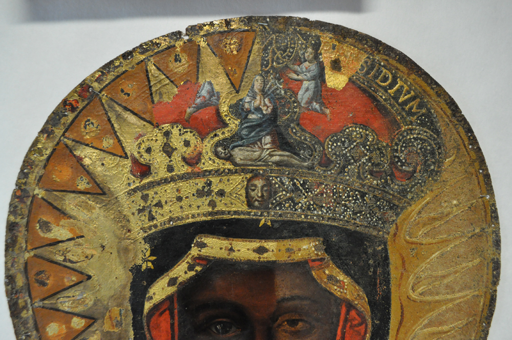 Zdaniem duchownego, najbardziej intrygująca jest sprawa odsłoniętej korony na skroniach Matki Boskiej. „Jest to przetransponowany wzór tzw. korony władysławowskiej, którą podarował dla ozdoby jasnogórskiego wizerunku król Władysław IV Waza w roku 1635” – dodał. Wskazał także na równie zaskakujący fakt, że na obłąku korony nie ma widniejącego w oryginale napisu „Tibi S. Maria”, lecz „Sub Tuum praesidium” (Pod Twoją obronę).